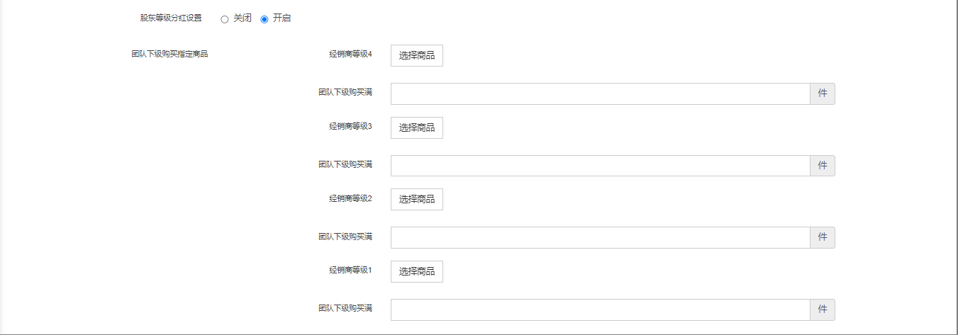 5、股东等级分红设置:开启股东等级分红设置,团队下线购买指定商品:需要订单完成收货后。这里的团队下级购买满(是指团队下会员订单加起来满30件即可)